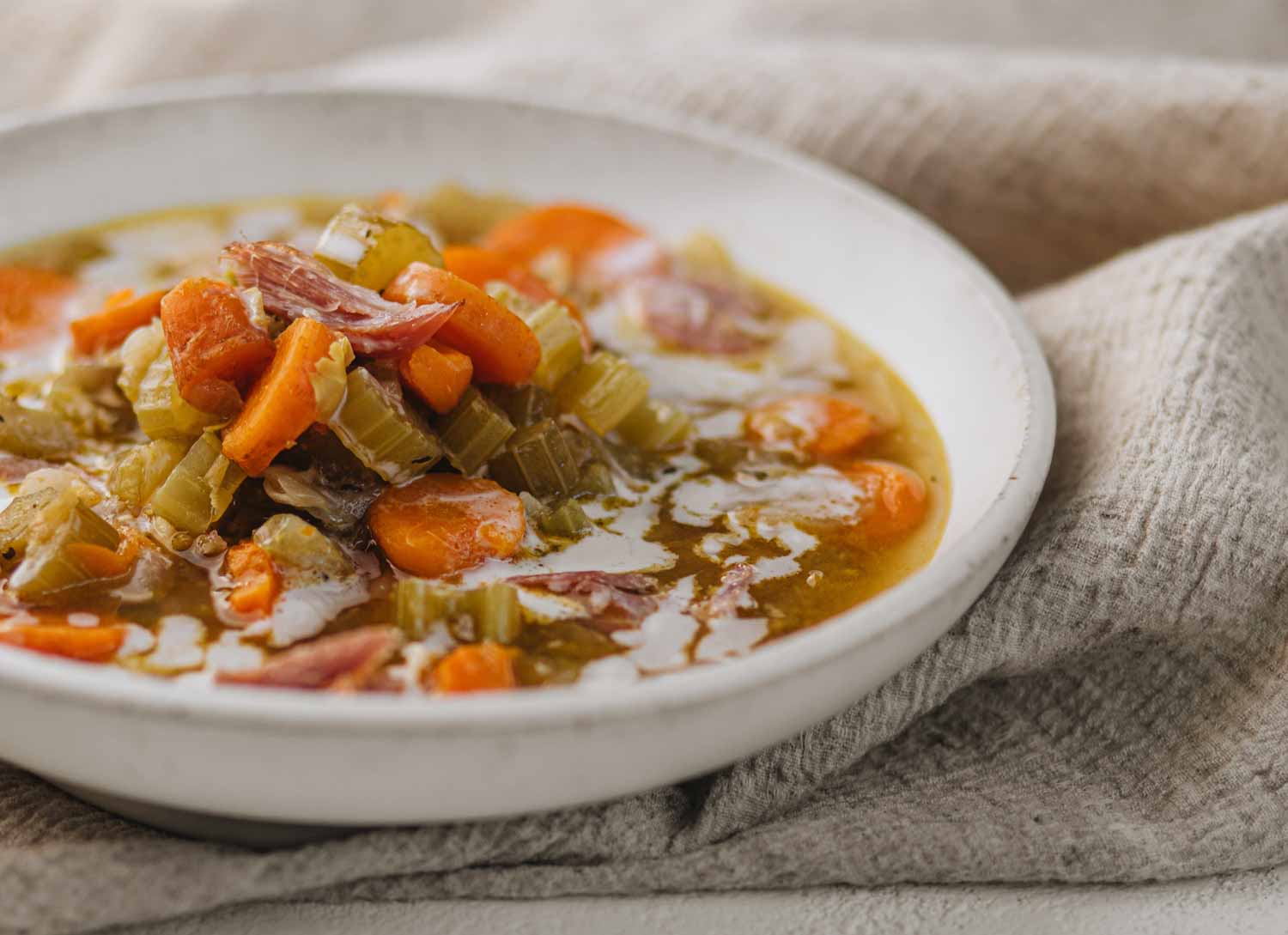 This soup has a brothy consistency. For a creamier texture, use an immersion blender to puree the soup before adding the shredded ham back into the pot.